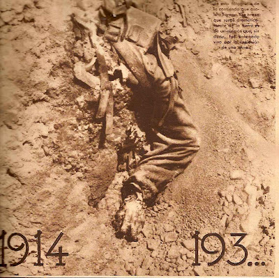 "Nuevo Mundo", de Barcelona, mostraba en 1933 los aires de guerra existentes en Europa. Es una foto más de las varias que he subido para mostrar los desastres ocasionados por la Gran Guerra. Cuando subió Hitler al poder, ya se consideraba el estallido de la Segunda Guerra Mundial como inevitable e inminente, conforme se aprecia en esta composición fotográfica.